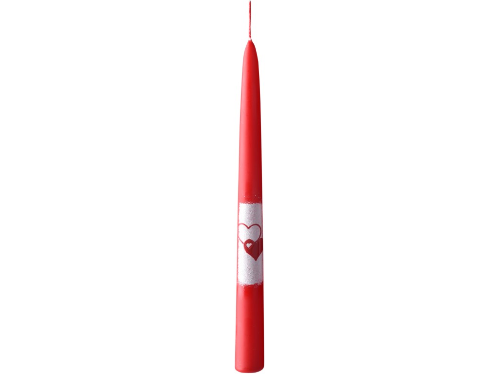 Kónická sviečka v červenej farbe so srdiečkovým motívom, vhodná na romantické príležitosti. Jej rozmery sú 22 x 230 mm.