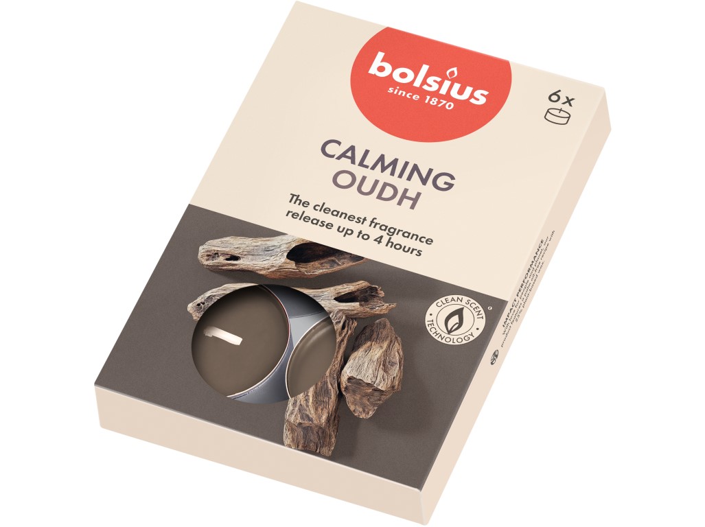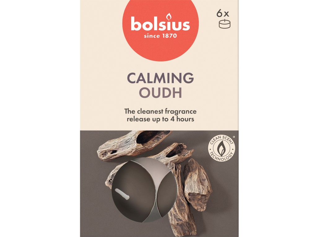 Výrazná, drevitá, korenistá vôňa vosku Bolsius Oud Wood v 6 praktických kusoch.
