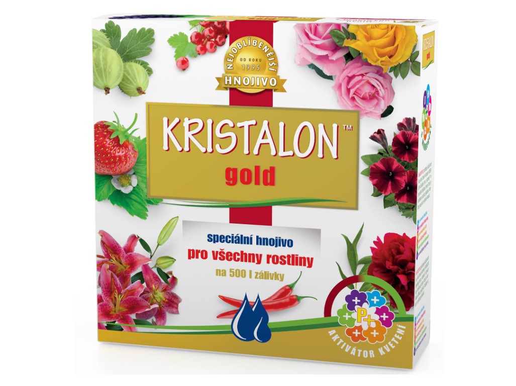 Hnojivo udržiava rastliny neustále v intenzívnom raste, zabezpečuje lepší a zdravší koreňový systém aj celkový stav rastlín, bohatšie kvitnutie a viac plodov. Kristalon Gold je univerzálne použiteľný pre ovocie, zeleninu, všetky druhy izbových aj vonkajších rastlín vrátane ovocných stromov a kríkov, vinič. Zabraňuje žltnutiu listov.Aktivátor kvitnutia je prvok, ktorý dodáva 75 % fosforu vo forme polyfosfátov, teda v pre rastliny prijateľnejšej a účinnejšej forme.